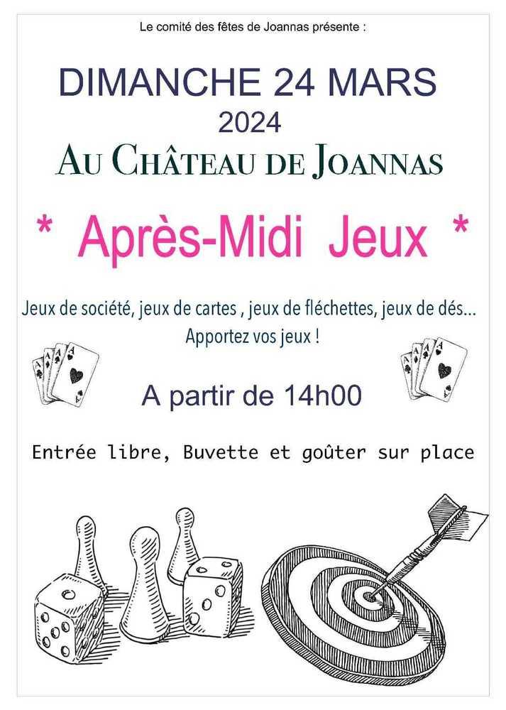 Après-midi jeux au château de Joannas ! Jeux de société, jeux de cartes, jeux de dès, jeux de fléchettes. Apportez vos jeux ! Buvette et gouter sur place.