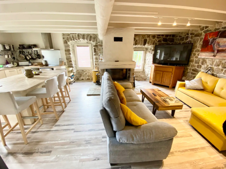 - Une grande pièce de vie avec une cuisine intégrée moderne et toute équipée, un ilot central et ses tabourets hauts, un vaste espace salon très cocooning composé de 2 canapés, d'une grand TV et d'une belle cheminée à bois d'époque apportant chaleur et convivialité.
