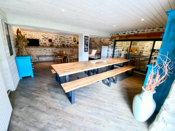 - Une autre grande pièce pour les repas de groupe avec une table de ferme, une table ronde, un coin salon avec un canapé convertible, une autre TV, une verrière décorative abritant une ancienne cheminée et un four à pain d'époque.
