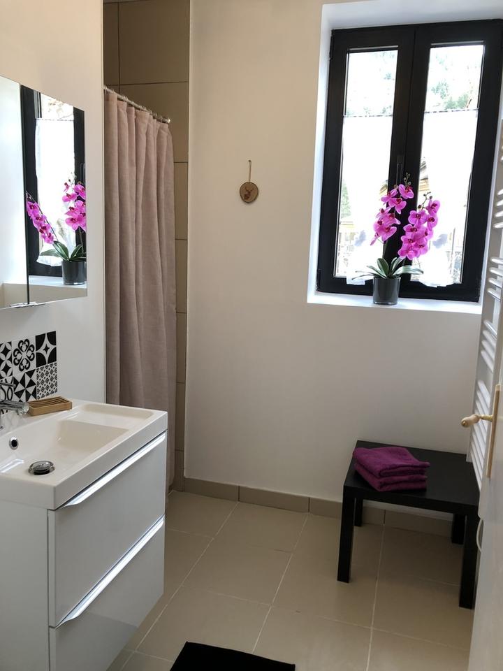 Grande salle de bain avec douche à l'italienne et sèche serviettes.