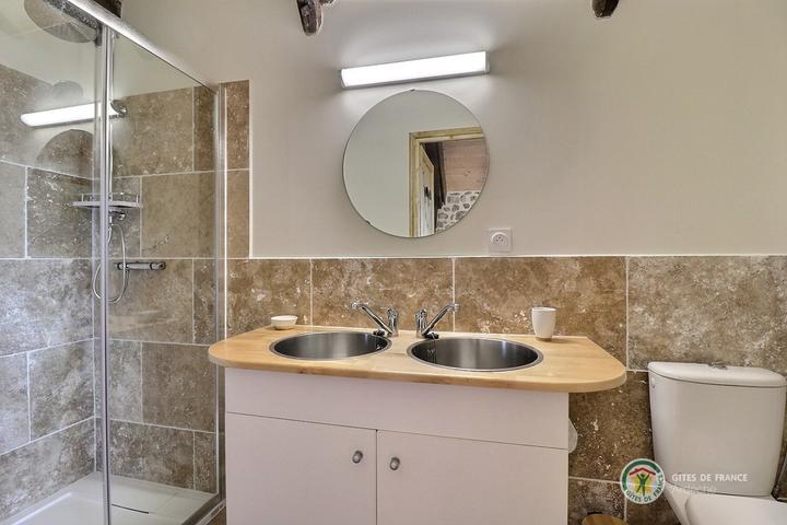 Le rez de chaussée est composé d'une chambre indépendante avec lit double (140 x 190), une salle de bain individuelle avec wc, une buanderie avec lave-linge et d'une terrasse.