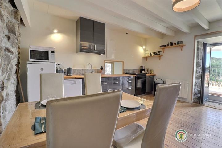 Au premier étage, vous trouverez un grand séjour avec cuisine entièrement équipée (cuisinière, four micro-onde, lave-vaisselle, cafetière, bouilloire…) télévision, canapé convertible (140 x 190) et une grande terrasse avec vue sur la vallée.
