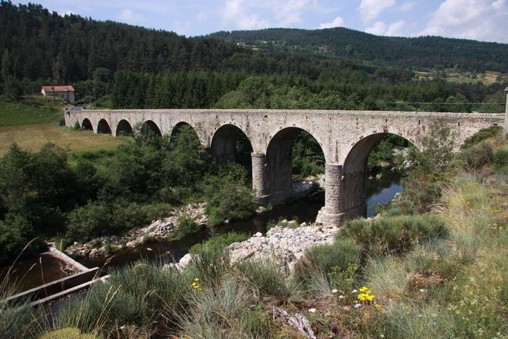 La Loire reçoit les eaux de la Veyradeyre sous le village du Lac d'Issarlès et file ensuite sous les arches du pont de la Borie.
