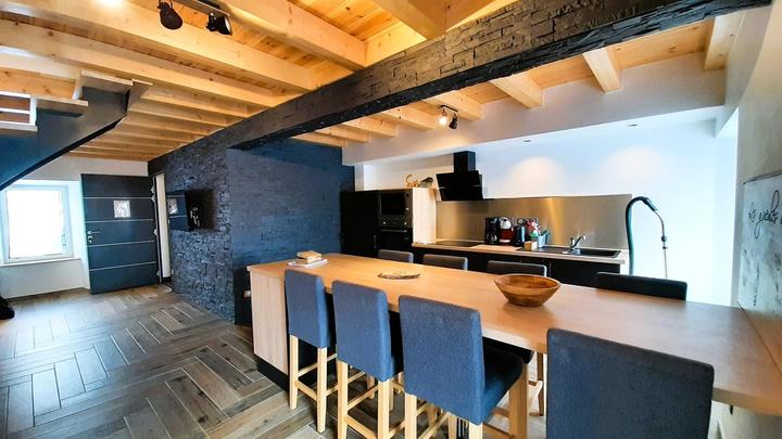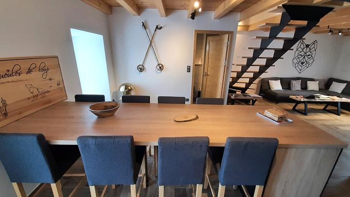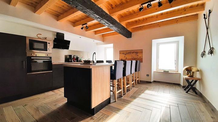 Les Gueules de loup : logement situé au 1er étage de la maison (entrée côté rue par un escalier intérieur) : grande pièce de vie : cuisine entièrement équipée : table îlot grand format avec rangements (2 grands tiroirs) + 8 chaises hautes assorties, évier, table à induction CANDY - 3 zones de cuisson, hotte aspirante, four électrique et four à micro-ondes encastrés, lave-vaisselle 13 couverts Super Silence, réfrigérateur 1 porte avec congélateur ****, cafetière électrique (filtres), machine à café - Nescafé Dolce Gusto (capsules), bouilloire électrique, grille-pain, appareil à raclette, batteur électrique avec accessoires, pied mixeur, vaisselle, ustensiles et batterie de cuisine, autocuiseur en Inox, ...
