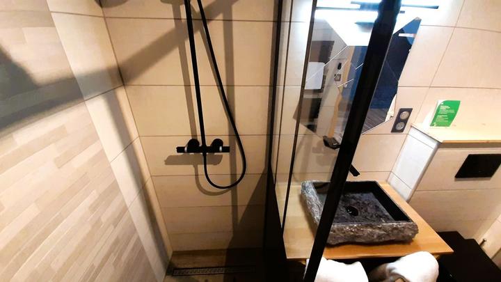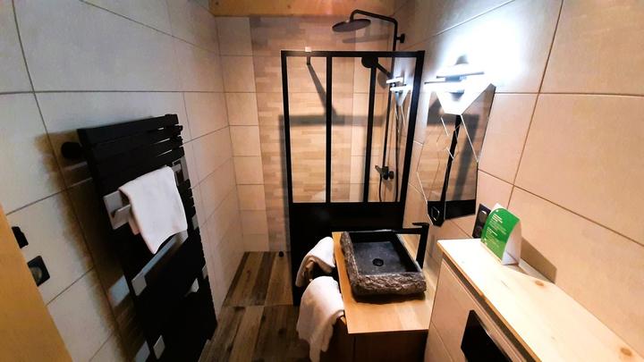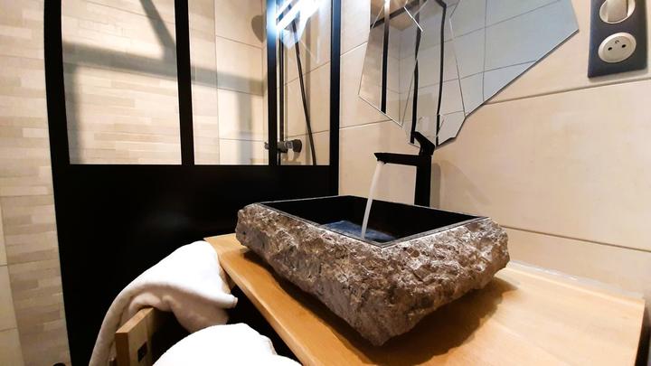 + colonne de douche (robinet mitigeur-thermostatique + douchette + tête de douche), 1 vasque en pierre sur meuble, sèche-serviettes électrique, ...