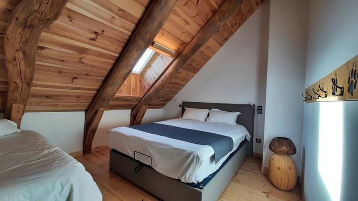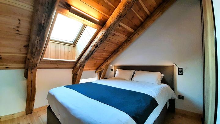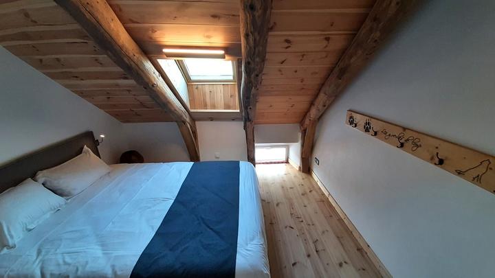 → Ch. 1 (pièce mansardée avec Velux) : 1 lit double en 160x200 cm et 1 lit simple en 90x190 cm.
