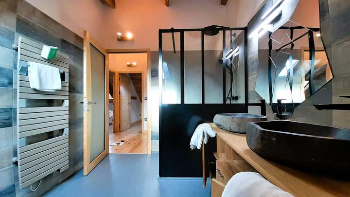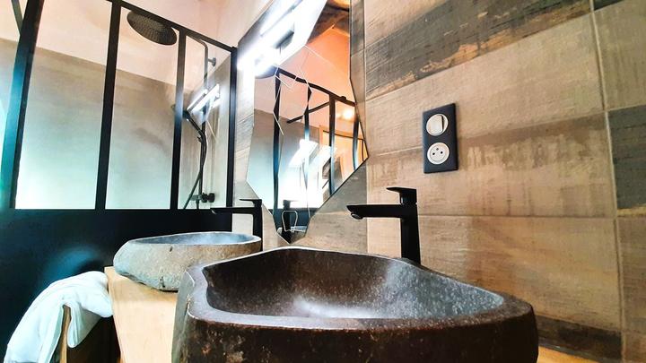 + colonne de douche (robinet mitigeur-thermostatique + douchette + tête de douche), 2 vasques en pierre sur meuble, sèche-serviettes électrique, ...