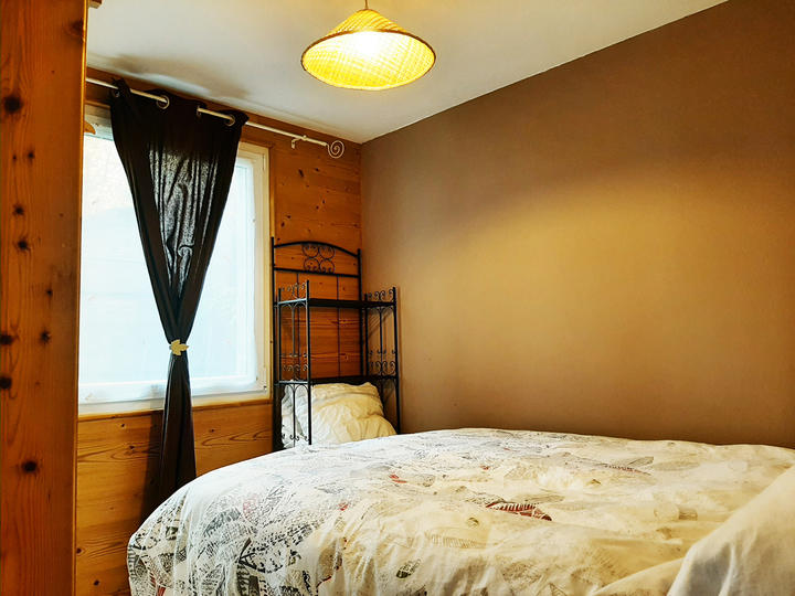 2 chambres indépendantes dont une chambre cabine : 1 lit 2 places en 140x190 cm, 2 lits superposés 1 pers. en 90x190 cm, 1 lit-tiroir 1 place en 90x190 cm. Salle d'eau avec douche grand format et WC. Chauffage géothermie par le sol.