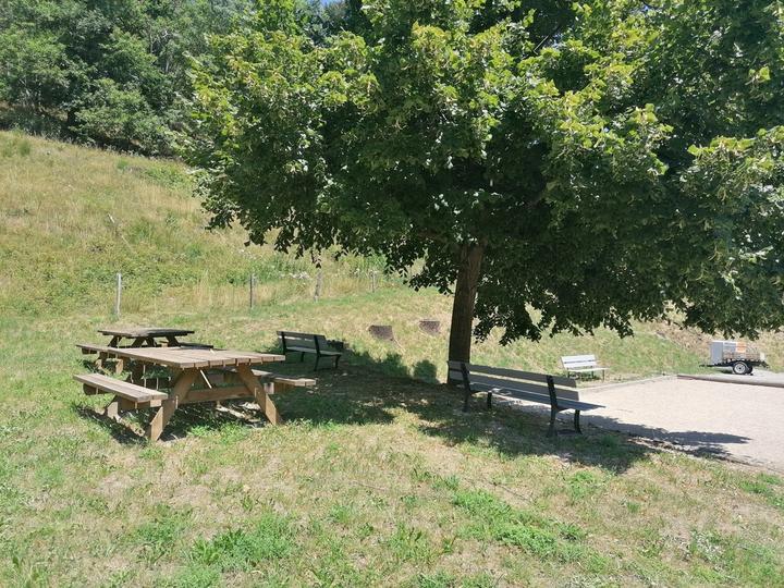Aire de stationnement pour camping-cars, avec tables de pique-nique ombragées et terrain de pétanque sur place.