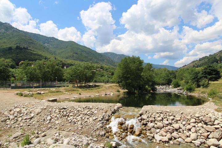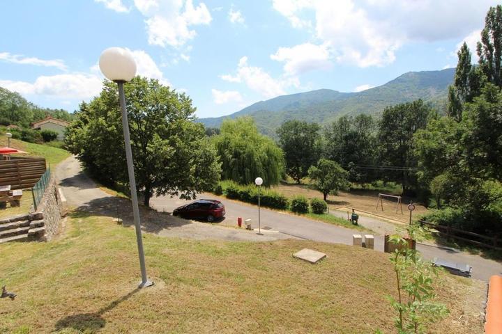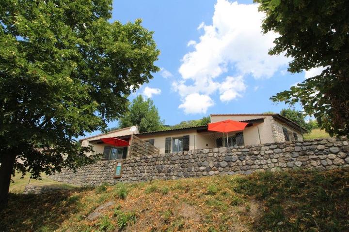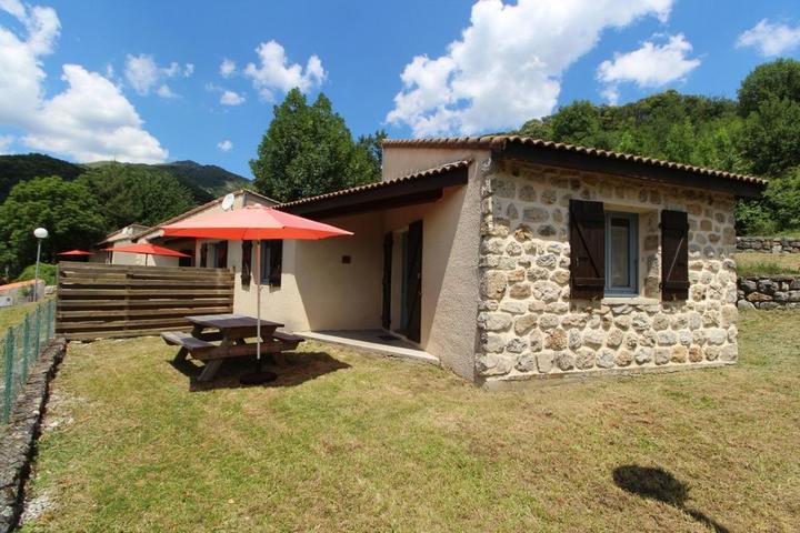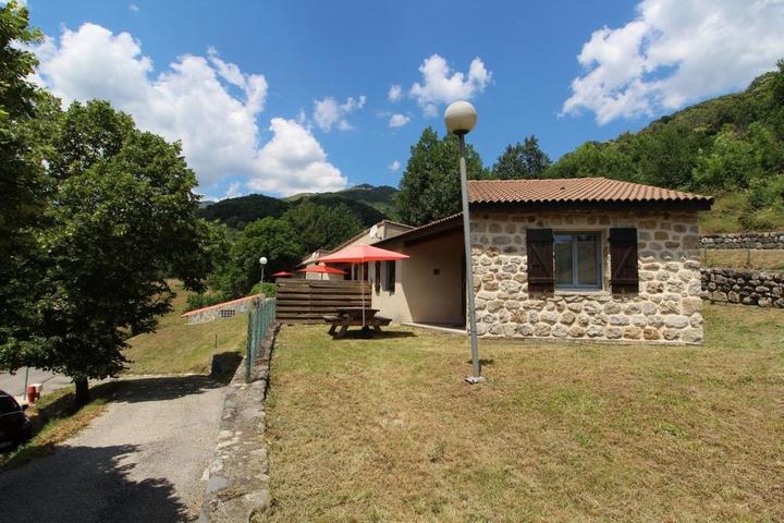 6 properties in gîte village in peaceful riverside setting on sunny slopes of the Tanargue in the Hautes Cévennes. Each gîte has private outdoor area. 4th gîte: living room, fitted kitchen area, bedroom (double bed), alcove communicating with main bedroom (2 single bunks), shower room/WC. Electric heating. Vals-les-Bains (spa town, casino, cinema) and Neyrac-les-Bains 15 min. Cleaning deposit: 100€.