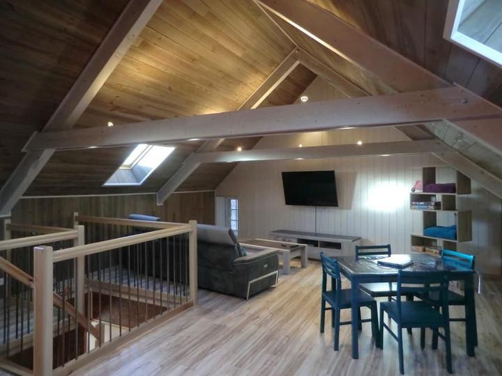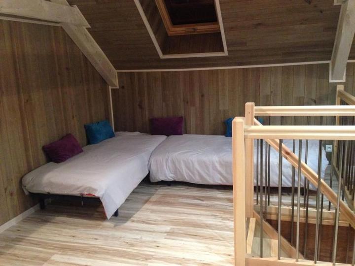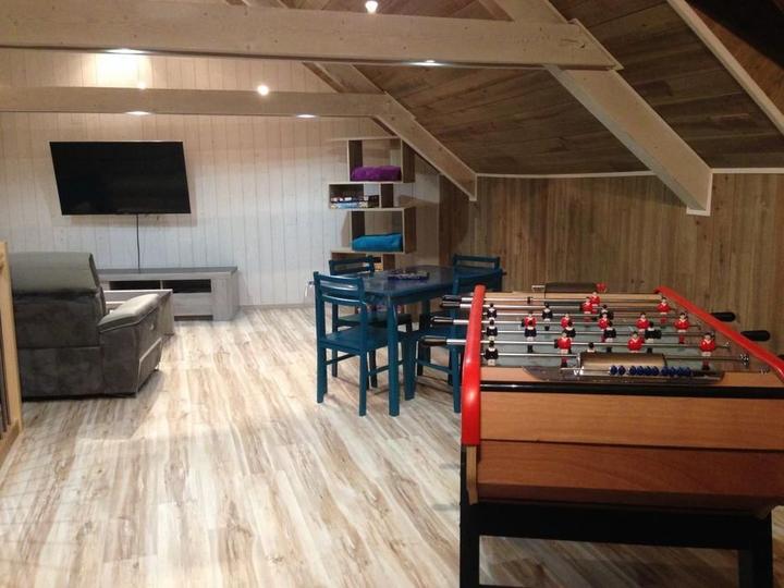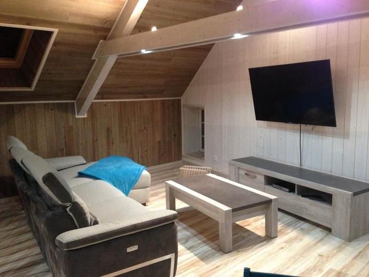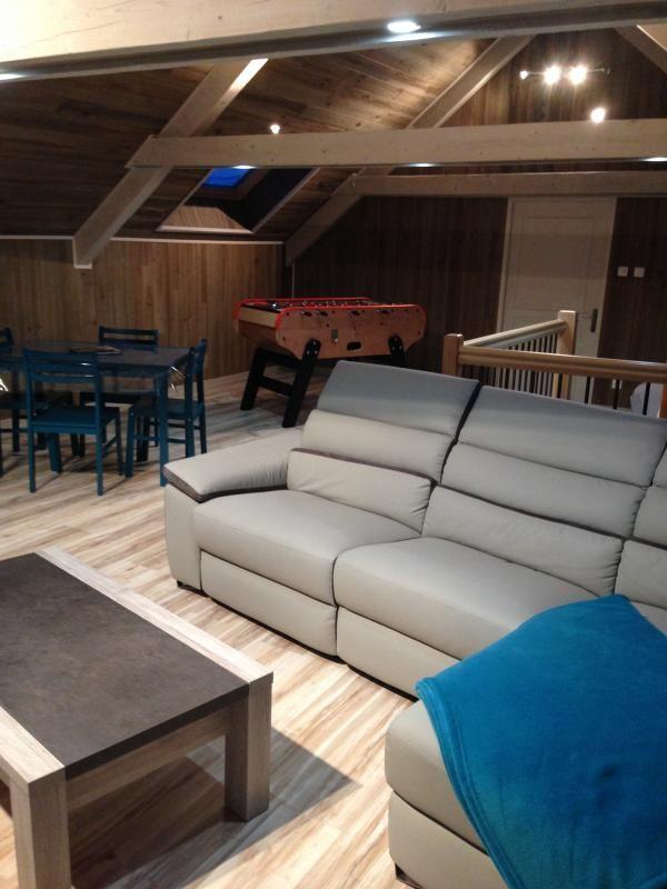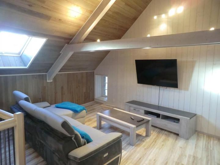 Séjour avec coin-cuisine intégré, coin-salon avec fauteuils relax et Tv écran plat. A l'étage, 3 chambres disposant chacune d'une salle d'eau privative. 1ch avec 2 lits 1 pers, 2ch avec 1 lit 2 pers. Terrasse de 30m² exposée au levant. Tous commerces au village. Environnement de montagne (champignons, charcuterie et fromage).