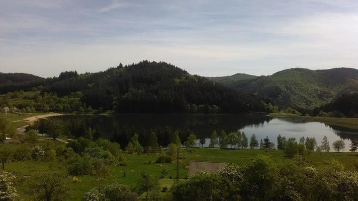 Volcan de type maar, le lac artificiel est niché pour partie dans un vaste cratère d'explosion dont on devine les bords. Le suc de Lestrat domine le lac, vestige d'une ancienne aiguille de lave détruite, en partie, par la mise en place du cratère.