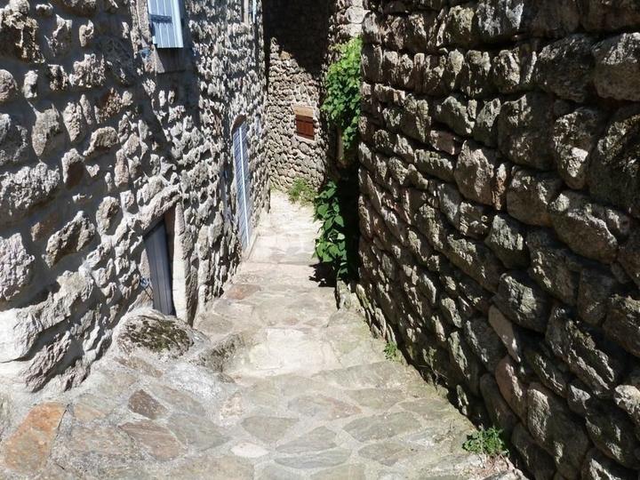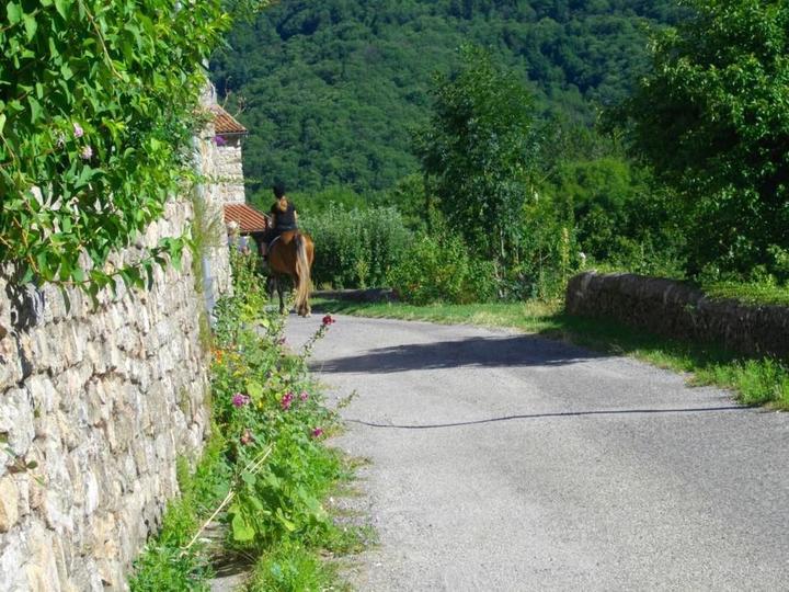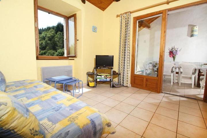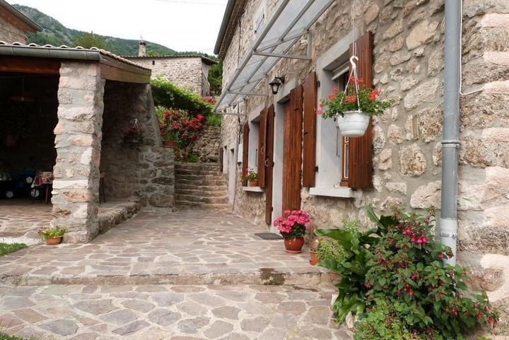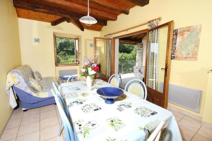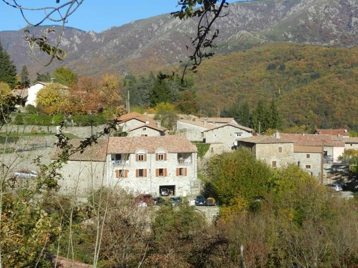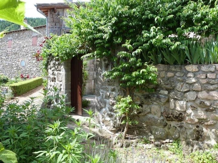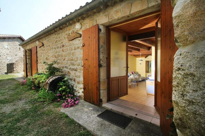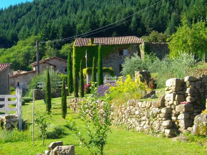2 self contained gîtes, in fully renovated stone house, in peaceful leafy setting below the Tanargue massif in the Monts d'Ardèche Regional Nature park. Les Chataigniers: living room, fitted kitchen area, 2 bedrooms (double bed) (4 single bunks), sofa, shower room, WC. Electric heating. Nearby: medieval villages of Largentière, Joyeuse and their markets, many other traditional villages. Walking/hiking trails on the doorstep. Lovely swimming spots in river Beaume. Ardèche Gorges (canoe), Pont d'Arc and many caves 30km. Large shops 23km. Unfenced garden shared by both gîtes at lower level beside a stream. Gîte at far end of hamlet.