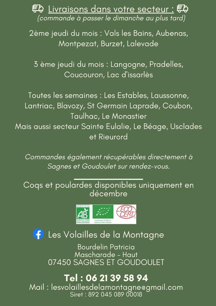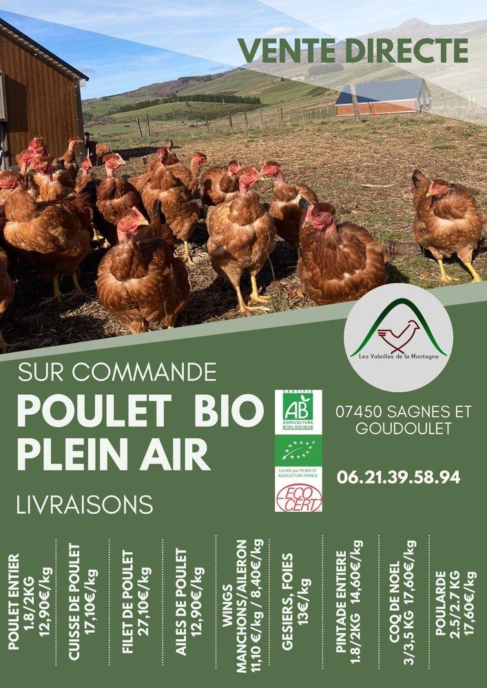 Elevage de poulets, pintades et en périodes des fêtes de fin d'année des poulardes et des coqs de Noël. Il est proposé aussi des rillettes 100% poulet bio et de la découpe de poulet (filets, cuisses, ailes, foies et gésiers).