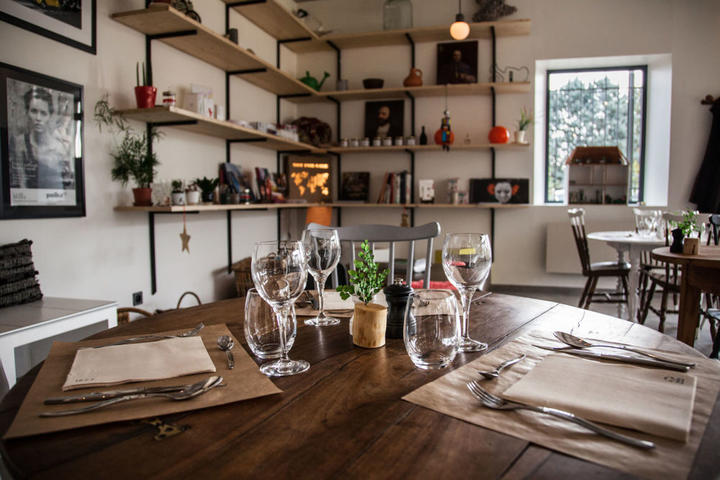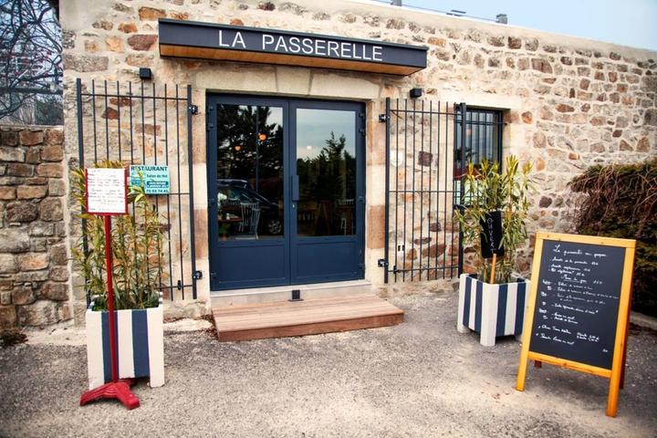 La Passerelle is designed like a large cleared space, opening on a pleasant courtyard garden. The atmosphere is elegant and simple. Wooden furniture, glassware and nice cutlery. The food is cooked in the kitchen with fresh seasonal produces. Vegetables define the seasons and give the opportunity to offer everyday some vegetarian food and traditionnal meal.